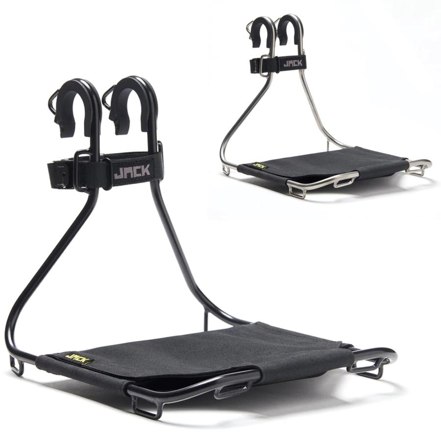 ヒップモンキーをハンドルにぶら下げた時に、フロントタイヤとの隙間が1cm位しかないので、接触予防のためにJACKのバイクラックを装着